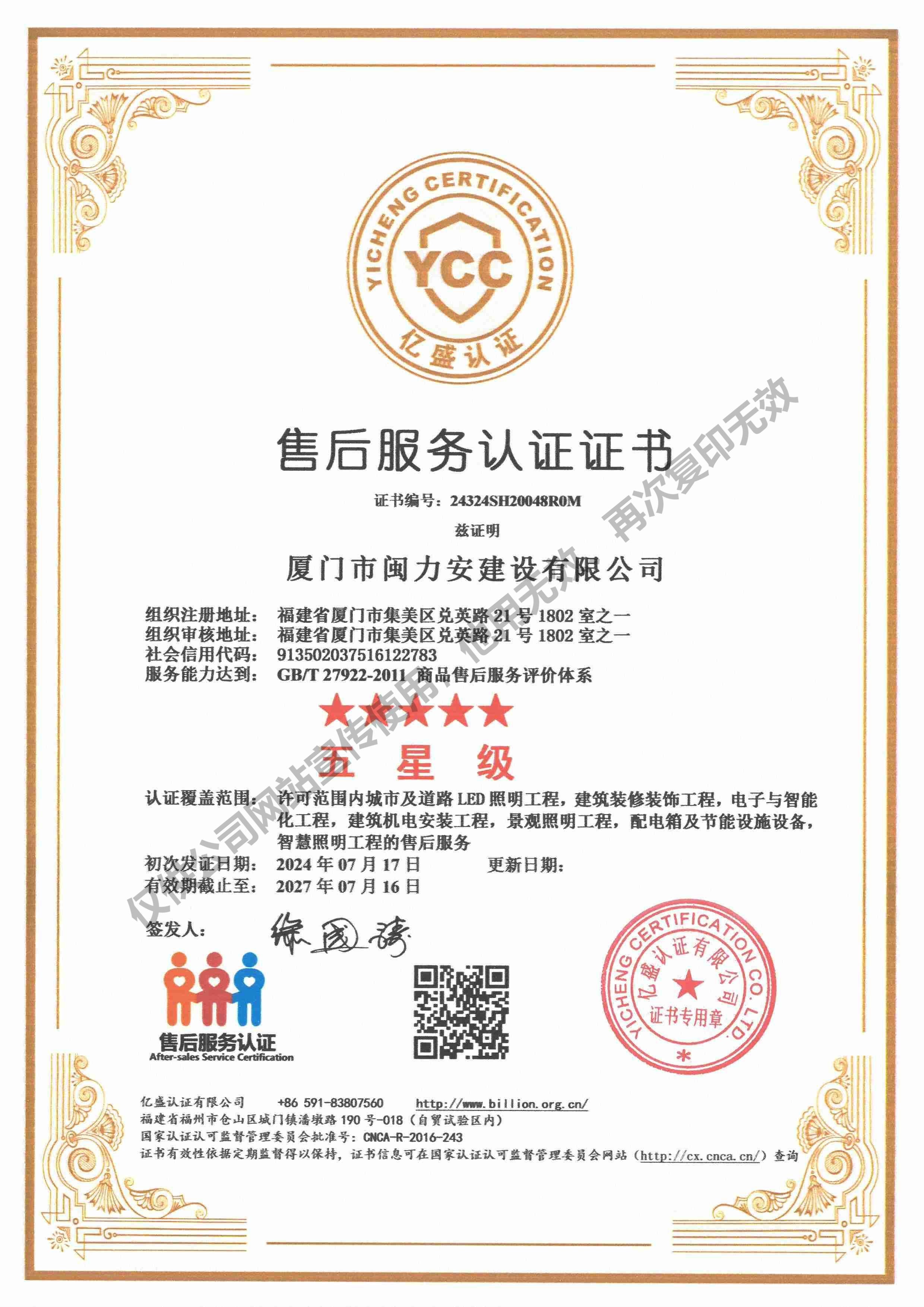 廈門市閩力安建設(shè)有限公司成立于2003年,公司取得市政公用工程施工總承包貳級、建筑裝修裝飾工程專業(yè)承包壹級、城市及道路照明工程專業(yè)承包壹級、電子與智能化工程專業(yè)承包貳級、消防設(shè)施工程專業(yè)承包貳級、電力工程施工總承包叁級、建筑機(jī)電安裝工程專業(yè)承包叁級、輸變電工程專業(yè)承包叁級、環(huán)保工程專業(yè)承包叁級、照明工程設(shè)計(jì)專項(xiàng)甲級、建筑裝飾工程設(shè)計(jì)乙級、施工勞務(wù)等資質(zhì)的綜合型企業(yè),公司于2013年通過了ISO9001質(zhì)量體系認(rèn)證,ISO14001環(huán)境管理體系認(rèn)證,OHSAS18001職業(yè)健康安全管理體系認(rèn)證。